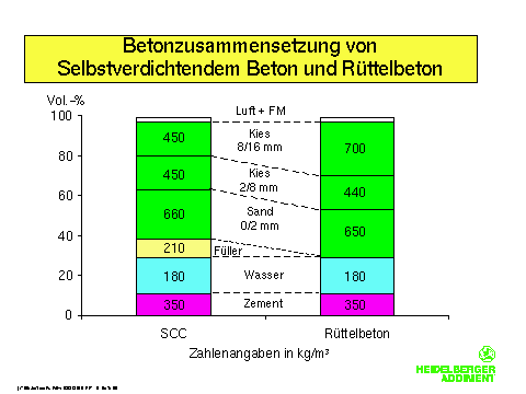 Eine typische Betonzusammensetzung für selbstverdichtenden Beton zeigt Bild 2. Der Vergleich mit Rüttelbeton macht deutlich, dass die Zement- und Wassermengen nicht verändert werden. Mit Hilfe eines Füllers wird der Leimgehalt erhöht. Aus Gründen der Fließfähigkeit wird der Grobkiesanteil reduziert.
